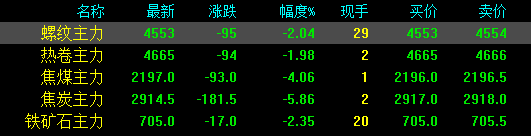 今日螺紋主力期貨跌95,收報(bào)4553,跌幅2.04%;熱卷主力跌94,收報(bào)4665,跌幅1.98%;焦煤主力跌93,收報(bào)2197,跌幅4.06%;焦炭主力跌181.5,收報(bào)2914.5,跌幅5.86%;鐵礦石主力跌17收報(bào)705,跌幅2.35%。