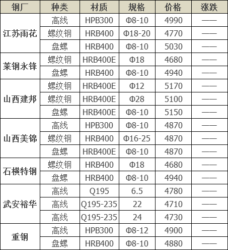 鋼廠調(diào)價今日建材共7家鋼廠調(diào)價發(fā)布,其中: