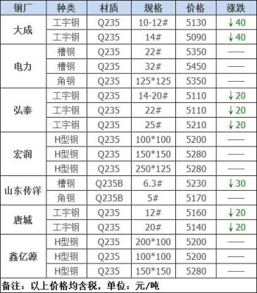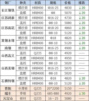 23日12:00起江陰西城刨花下調(diào)30-40,其他不變,調(diào)后:精爐料4000重廢3890中廢3830普通爐料3770鋼筋頭4000沖子3890-3940冷熱軋料3790-3890爐料壓塊3600鐵皮壓塊3300鋼刨花3660數(shù)控刨花3570普通刨花3480刨花壓塊3420刨花長(zhǎng)絲3360含稅單位:元/噸。
