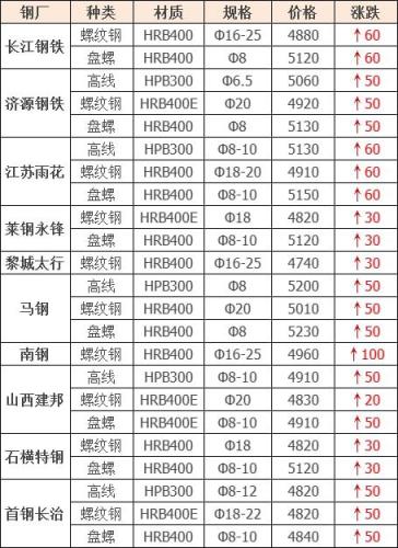漲幅最高為南鋼螺紋鋼;