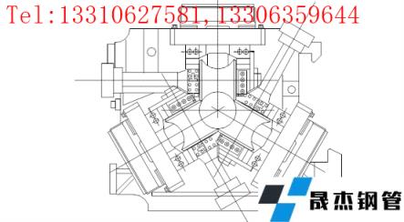 5.2.3.5 芯棒支撐架在連軋機架之間有4個三輥式芯棒自對中裝置,這些機架都帶有依芯棒規格進行調整的裝置。芯棒支撐輥由液壓缸控制,在沒有毛管通過時抱住芯棒,使芯棒處在軋制中心線上。當毛管逐架軋到之前,支撐輥打開使毛管處于軋輥軋制下,芯棒位置由軋制孔型確定在軋制線上。從結構上保證芯棒處于軋制中心線,使軋出的管子減少壁厚不均等缺陷。這四架三輥支撐架分別位于VRS前、1~2之間、3~4之間和第5架之后。芯棒支撐架結構如下圖。