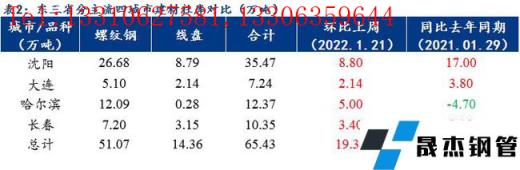 各主流城市分倉庫來看,本周沈陽市場幾大主流倉庫增庫較多;本周大連遠東鋼材市場新鵬輝到貨較多,其余倉庫新?lián)徜撘苍陉懤m(xù)到貨。吉林省內(nèi)長春兩大主流倉庫現(xiàn)貨庫存也在增加。從無縫鋼管廠家產(chǎn)量及庫存來看,本周區(qū)域內(nèi)樣本無縫鋼管廠家總產(chǎn)量43.1萬噸,較上周增.9萬噸;廠庫總量12.56萬噸,較上周減少1.01萬噸,社庫則大幅度增20.24萬噸;本周無縫鋼管廠家產(chǎn)量增、廠庫降、社庫繼續(xù)大增,主要原因是部分無縫鋼管廠家復產(chǎn)、產(chǎn)量略有回升,廠庫繼續(xù)前移至市場,而貿(mào)易商由于下游無需求幾乎也無成交,預計春節(jié)過后區(qū)域內(nèi)社會庫存將繼續(xù)增加。