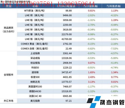 金融市場:本周主要商品期貨品種多下跌,其中黃金大跌8.27%;全球股市中,中歐股市基本下跌,美國股市跌后反彈;美元指數(shù)97.21,上漲1.65%。
