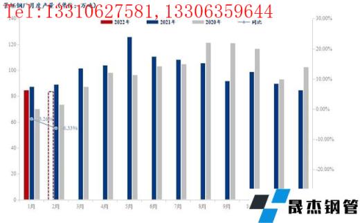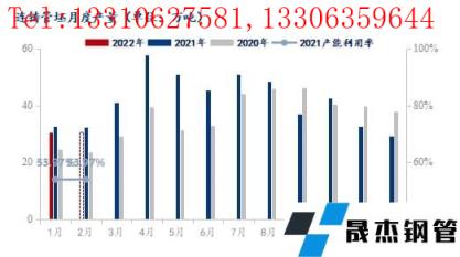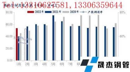 2、2022年2月管坯無縫厚壁鋼管廠家計劃排產83.5萬噸,較1月份實際產量減少1.1萬噸,2月份計劃產能利用率為53.98%,較1月實際產能利用率減少0.71%;
