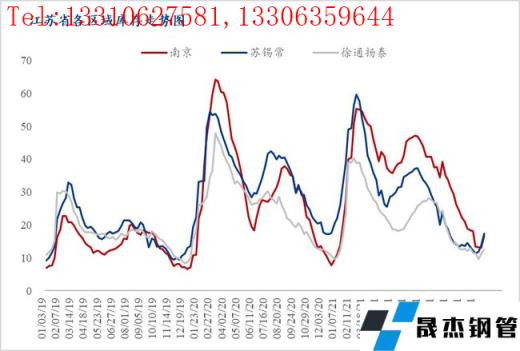 如上圖所示,2020年1月23日省會(huì)南京市場庫存占全省現(xiàn)貨庫存的21%左右,屬全年較低水平;而4月9日前后基本占全省庫存的41%;20年上半年南京市場庫存均保持較高水平,而下半年開始庫存便逐漸走低,蘇錫常庫存累庫增加。2021年1月8日南京庫存占全省庫存的24%,從4月初開始到本年度結(jié)束,南京庫存占比基本維持在40-42%左右,11月5日占比最高達(dá)到年度最高值,約50/%。2021年全年,南京市場庫存均保持較高水平,僅在年初階段,蘇錫??値齑媛愿哂谀暇?。整體來看,今年南京市場現(xiàn)貨資源一直處于相對(duì)充裕的狀態(tài),且部分無縫厚壁鋼管廠家?guī)齑媲耙埔彩潜WC該市場建材供給較為穩(wěn)定的重要因素,而徐通揚(yáng)泰區(qū)域則因價(jià)格波幅巨大,市場參與者主動(dòng)囤貨意愿不高,全年庫存相較去年小幅減量。