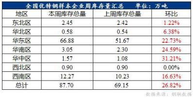 全國優特鋼棒材樣本總庫存87.7萬噸,環比上升18.55萬噸,增幅26.82%。