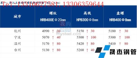 從浙江省今日價格來看,省內價格有所上漲。其中杭州市場建筑厚壁無縫鋼管價格較昨日上漲30元/噸;寧波市場建筑厚壁無縫鋼管價格較昨日上漲40-100元/噸;溫州市場建筑厚壁無縫鋼管價格統漲80元/噸;臺州市場建筑厚壁無縫鋼管價格較昨日上漲40-110元/噸 。