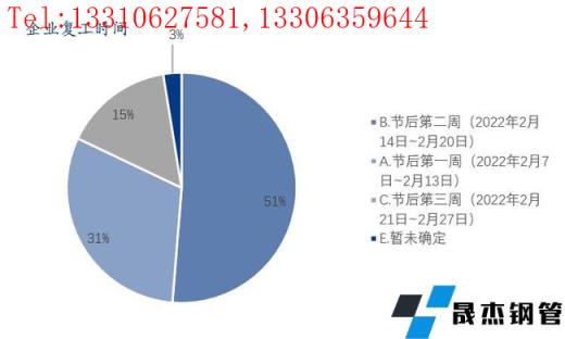 2、節(jié)后復(fù)工時間較去年同比明顯提前。調(diào)研時已全部復(fù)工的企業(yè)占比59%;已部分復(fù)工的企業(yè)占比26%。節(jié)后第一周(2022年2月7日-2月14日)能全部復(fù)工的占比31%;節(jié)后第二周節(jié)后第二周(2022年2月15日-2月22日)能全部復(fù)工的占比51%。