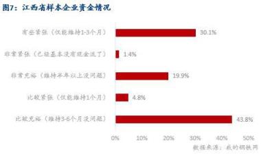 4、調(diào)研企業(yè)資金情況發(fā)現(xiàn):從企業(yè)當(dāng)前現(xiàn)金流情況來(lái)看,據(jù)調(diào)研,63.7%的樣本企業(yè)資金流是比較或者非常充裕的,30.1%的樣本企業(yè)資金有些緊張,僅能維持1-3個(gè)月,而資金壓力比較及非常緊張的樣本企業(yè)占比6.2%。