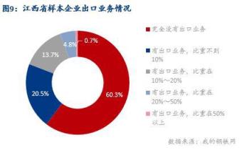 據(jù)調(diào)研,61%的樣本企業(yè)沒(méi)有出口業(yè)務(wù),39 %的樣本企業(yè)有出口業(yè)務(wù),出口業(yè)務(wù)比重大多集中在10%以?xún)?nèi)。