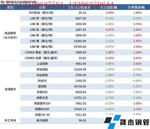 金融市場:本周主要商品期貨品種多上漲,其中白銀上漲5.01%;全球股市中,中國股市中僅上證指數(shù)上漲3.02%,美國三大股指均收跌,歐洲股市上漲;美元指數(shù)96.03,上漲0.59%。