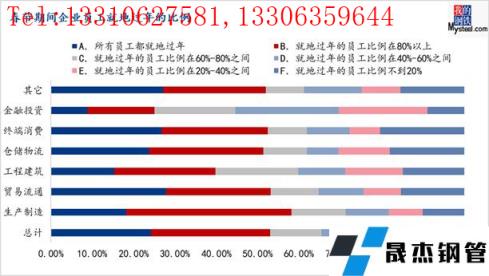 根據3805家企業的調研情況,今年用工和去年相比略微緊張一些。在崗員工較實際需要存在較大缺口(超過10%)的企業占比為10.35%,較去年上升了1個百分點;在崗員工較實際需要存在一定缺口(5%-10%)的占比31.12%,較去年上升了2.5個百分點;在崗員工與實際需要基本匹配的比例為54.01%,較去年同期下降了4.8個百分點,在崗員工明顯超過實際需要(5%-10%)的比例為3.02%、在崗員工大幅超過實際需要(超過10%)的比例為1.50%。調研數據表明,今年鋼鐵行業企業用工有一定的缺口,節后多數企業可能擴大人員規模;分類型來看,工程建筑也的用工缺口最大,其次為生產制造、金融投資兩個領域。