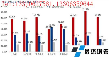 本次調研的3805家鋼鐵企業中,已全部復工企業2202家,已經部分復工企業1125,尚未復工企業478,占比分別為57.87%、29.57%、12.56%。同期相比,已經復工企業較去年降低了8個百分點,尚未復工企業比例增加1個百分點,部分復工企業占比上升較為明顯。