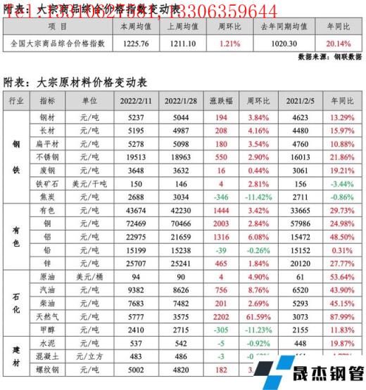 免責聲明:本網站(山東聊城晟杰無縫鋼管廠www.qiazhuo.cn)刊載的“MRI:大宗原材料價格周報(2月7日-2月11日)”等均源于網絡,版權歸原作者所有,且僅代表原作者觀點,本文所載信息僅供參考。轉載僅為學習與交流之目的,如無意中侵犯您的合法權益,請及時聯系刪除。本網站刊登此篇文章并不意味著本站贊同其觀點或證實其內容的真實性,我們不對其科學性、嚴肅性等作任何形式的保證。如果侵犯了您的版權,請盡快聯系我們予以撤銷,謝謝合作!