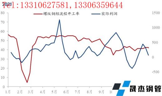 而對于2021年的數(shù)據(jù)來說無論是相關(guān)分析還是回歸分析結(jié)果表現(xiàn)出與其他年份有不同的結(jié)果,這與2021年的特殊情況有關(guān)。由于2021年螺紋鋼價格的急劇變化,導(dǎo)致電弧爐實際利潤具有了極強的波動性,而且由于能耗雙控,從8月底電弧爐無縫厚壁鋼管廠家被嚴(yán)格限產(chǎn),導(dǎo)致了電弧爐開工率有近20%左右的持續(xù)下降,創(chuàng)造了歷史低位,政策以及成材價格變動明顯干擾了數(shù)據(jù)的觀測,如下圖所示: