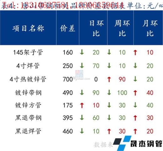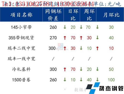 145帶鋼與鋼坯價差小幅收窄,焊管與355帶鋼價差收窄。熱卷與帶鋼價差縮小,價格基本持平。