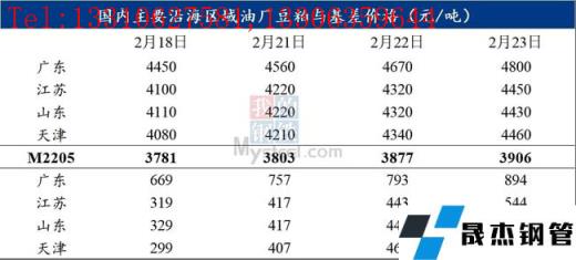 具體來看下表最近4個交易日豆粕期現(xiàn)貨價格,以沿海主要區(qū)域廣東、江蘇、山東、天津為例。出現(xiàn)豆粕現(xiàn)貨單邊價格與基差價格齊飛盛況,怎一“漲”’字了得?豆粕現(xiàn)貨價格每個交易日超100元/噸的速度飛奔。據(jù)農(nóng)產(chǎn)品數(shù)據(jù)顯示,沿海主要區(qū)域2月18-2月22日現(xiàn)貨價格由4080-4450元/噸,漲至4430-4800元/噸,累計上漲350元/噸,累計漲幅7.87%-8.58%;現(xiàn)貨基差價格由299-699元/噸,漲至524-894元/噸,累計上漲195-225元/噸,累計漲幅2.79-7.53%。