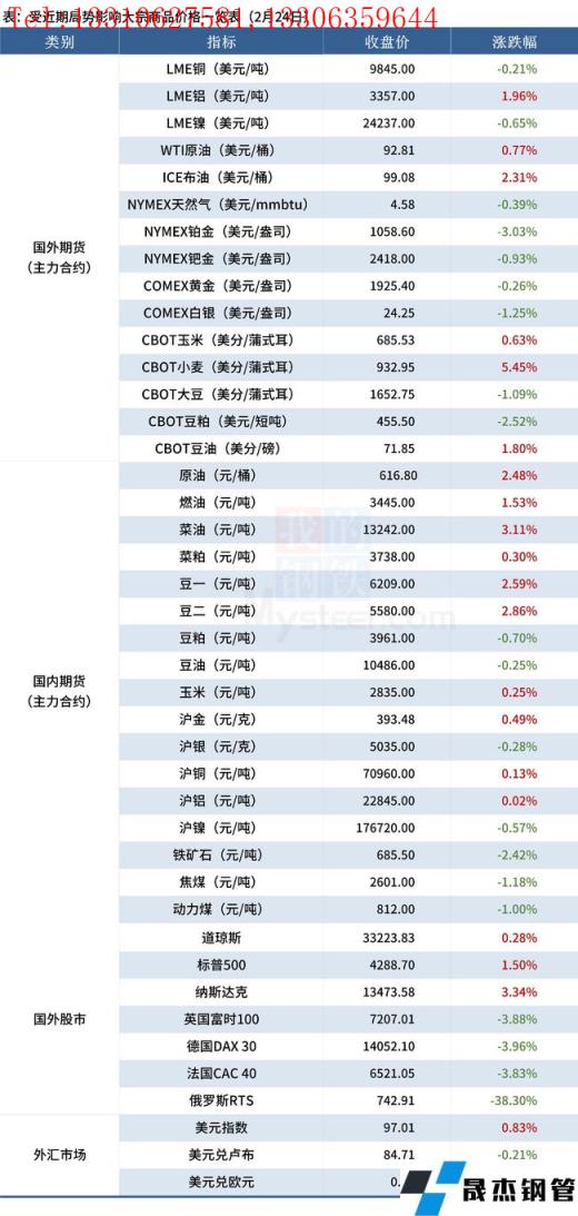 免責聲明:本網(wǎng)站(山東聊城晟杰無縫鋼管廠www.qiazhuo.cn)刊載的“受近期局勢影響大宗商品價格一覽表(2月24日)”等均源于網(wǎng)絡,版權(quán)歸原作者所有,且僅代表原作者觀點,本文所載信息僅供參考。轉(zhuǎn)載僅為學習與交流之目的,如無意中侵犯您的合法權(quán)益,請及時聯(lián)系刪除。本網(wǎng)站刊登此篇文章并不意味著本站贊同其觀點或證實其內(nèi)容的真實性,我們不對其科學性、嚴肅性等作任何形式的保證。如果侵犯了您的版權(quán),請盡快聯(lián)系我們予以撤銷,謝謝合作!