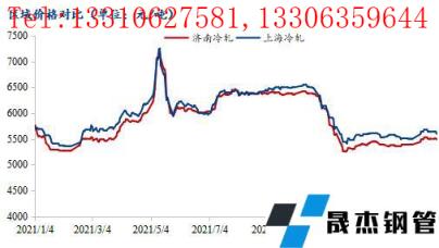 2021年上海冷軋板卷最高價7250元/噸,最低價5360元/噸,均價6014元/噸,全年高低價差1890元/噸。濟南冷軋板卷最高價7170元/噸,最低價5250元/噸,均價5914元/噸,全年高低價差1920元/噸。同一交易日上海-濟南冷軋價差全年最高240元/噸,最低-250元/噸,均價99元/噸。