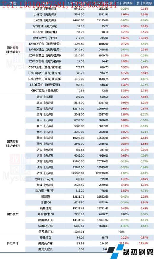 免責(zé)聲明:本網(wǎng)站(山東聊城晟杰無縫鋼管廠www.qiazhuo.cn)刊載的“受近期局勢影響大宗商品價格一覽表(2月28日)”等均源于網(wǎng)絡(luò),版權(quán)歸原作者所有,且僅代表原作者觀點,本文所載信息僅供參考。轉(zhuǎn)載僅為學(xué)習(xí)與交流之目的,如無意中侵犯您的合法權(quán)益,請及時聯(lián)系刪除。本網(wǎng)站刊登此篇文章并不意味著本站贊同其觀點或證實其內(nèi)容的真實性,我們不對其科學(xué)性、嚴(yán)肅性等作任何形式的保證。如果侵犯了您的版權(quán),請盡快聯(lián)系我們予以撤銷,謝謝合作!