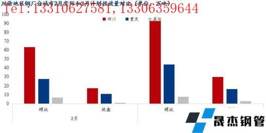 2、3月份川渝地區建筑厚壁無縫鋼管生產企業計劃投放總量192.67萬噸,環比增加52.33%;其中螺紋鋼計劃投放144.52萬噸,環比增加49.36%,線盤計劃投放48.15萬噸,環比增加41.88%。
