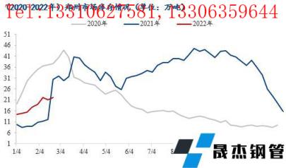 2022年河南市場整體冬儲量遠超去年,但實際節后到貨情況低于預期,主要減量是在個別省內無縫厚壁鋼管廠家螺紋產線仍未復產,且盤螺線臨近2月中下旬恢復正常生產,多數冬儲量未交付;此外冬奧會期間省外無縫厚壁鋼管廠家生產不暢,到貨節奏偏緩,整體省內累庫速度后延。據數據統計,截止至2月25日,鄭州市場建筑厚壁無縫鋼管庫存在22.2萬噸,年同比降幅在26.8%。據市場反饋,2022年河南省基建項目新開工居多,彌補部分房建缺口,在下游工地需求緩慢釋放下,大部分資源已發至工地。但隨著部分無縫厚壁鋼管廠家要求代理商將冬儲資源全部提走,近期資源已從廠庫陸續轉移至社庫,且疊加3月份代理商正常協議量,預估3月下旬至4月初鄭州市場庫存或面臨峰值,但庫存峰值或低于去年水平。