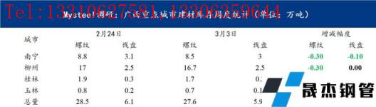 本周廣西地區螺紋資源社會庫存整體下降,商家出貨好轉。進入3月,厚壁無縫鋼管原料消息面有所放寬,需求復蘇,整個黑色系期貨近期首次出現全面大幅拉漲,市場看漲氛圍濃厚,給予市場較大的操作空間。同時,在期貨的刺激下廣西本地需求進一步釋放,周二商家迎來了出貨拐點,當天成交爆發式增長,為后續成交奠定基礎。從資源分配來看,南寧區域由于部分商家的資源從廠里直發進入工地,進入倉庫資源相對有限,因而南寧庫存出現小幅度下降。同時,柳鋼本部生產飽和度較低,廣西投放資源有限,柳州社會庫存也出現不增反降局面。價格方面,無縫厚壁鋼管廠家出廠價推漲及時,本周截至周四廣西推漲90元/噸,但從周邊市場來看,廣西價格處于低位,周邊資源流入利潤空間較少,整體流入量有所下降。截至目前,廣西市場庫存建筑厚壁無縫鋼管33.58萬噸,較上周相比減少1.02萬噸。