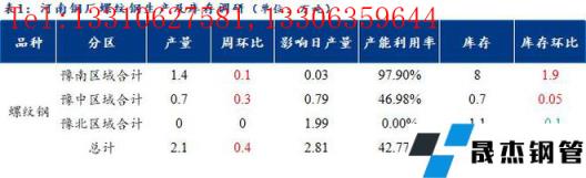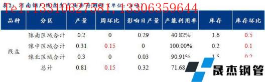 1、調(diào)研數(shù)據(jù)顯示,統(tǒng)計的河南地區(qū)10家建筑厚壁無縫鋼管樣本無縫厚壁鋼管廠家中,河南省無縫厚壁鋼管廠家線盤日均產(chǎn)量0.81萬噸,較上周小幅增加0.15萬噸;檢修/限產(chǎn)影響建材日產(chǎn)量為0.32萬噸,產(chǎn)能利用率71.68%,較上周上升13.27%。