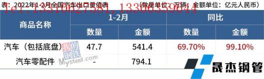 免責(zé)聲明:本網(wǎng)站(山東聊城晟杰無(wú)縫鋼管廠www.qiazhuo.cn)刊載的“海關(guān)總署:1-2月中國(guó)出口汽車(chē)47.7萬(wàn)輛,同比增99.10%”等均源于網(wǎng)絡(luò),版權(quán)歸原作者所有,且僅代表原作者觀點(diǎn),本文所載信息僅供參考。轉(zhuǎn)載僅為學(xué)習(xí)與交流之目的,如無(wú)意中侵犯您的合法權(quán)益,請(qǐng)及時(shí)聯(lián)系刪除。本網(wǎng)站刊登此篇文章并不意味著本站贊同其觀點(diǎn)或證實(shí)其內(nèi)容的真實(shí)性,我們不對(duì)其科學(xué)性、嚴(yán)肅性等作任何形式的保證。如果侵犯了您的版權(quán),請(qǐng)盡快聯(lián)系我們予以撤銷(xiāo),謝謝合作!