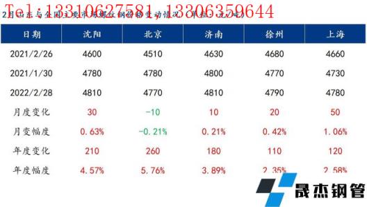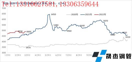2月,山東建筑厚壁無縫鋼管價格窄幅震蕩上行。截至2月28日,山東建筑厚壁無縫鋼管價格(螺紋鋼為例)從上月跌4800元/噸上漲至4810元/噸,環比上漲10元/噸、漲幅0.2%。全月最高價格4930元/噸,最低價格4750元/噸,波動幅度180元/噸。雖然2022年2月平均價格較去年上漲了392元/噸,較2020年上漲了1243元/噸,但是對比來看,今年2月震蕩幅度相對較小,價格要溫和的多。