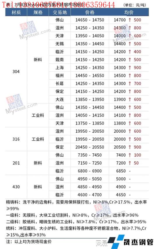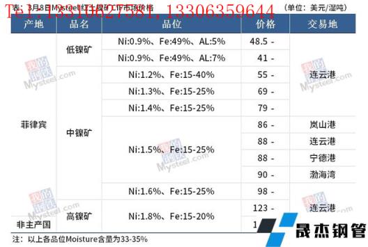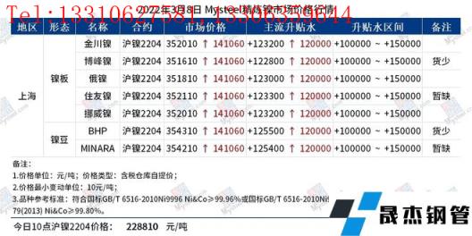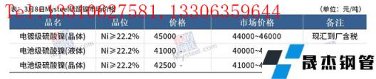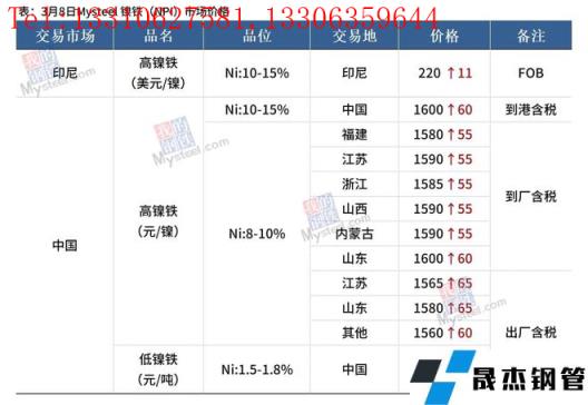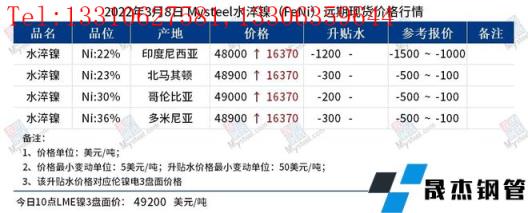 免責聲明:本網站(山東聊城晟杰無縫鋼管廠www.qiazhuo.cn)刊載的“鎳產業鏈價格(2022.3.8)”等均源于網絡,版權歸原作者所有,且僅代表原作者觀點,本文所載信息僅供參考。轉載僅為學習與交流之目的,如無意中侵犯您的合法權益,請及時聯系刪除。本網站刊登此篇文章并不意味著本站贊同其觀點或證實其內容的真實性,我們不對其科學性、嚴肅性等作任何形式的保證。如果侵犯了您的版權,請盡快聯系我們予以撤銷,謝謝合作!