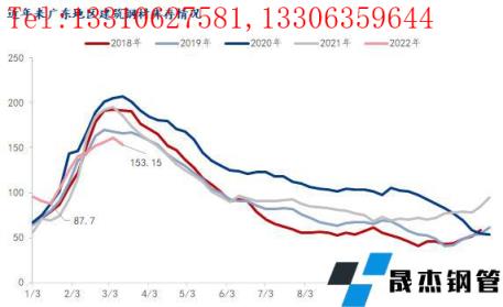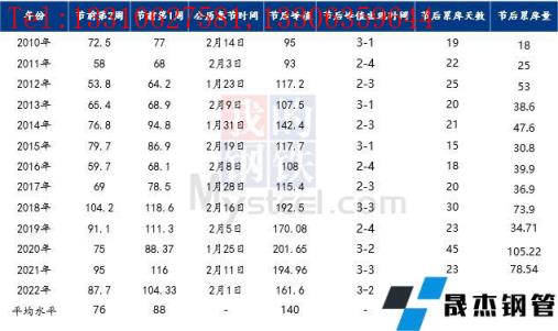 對(duì)比歷史數(shù)據(jù)來看,近10年來春節(jié)后廣州建筑厚壁無縫鋼管庫(kù)存峰值均出現(xiàn)第3-5周,累庫(kù)周期約24天左右;近5年來節(jié)后庫(kù)存累庫(kù)量明顯上升,節(jié)后峰值水平均超過150萬噸以上,而2017年之前節(jié)后庫(kù)存峰值均在140萬噸以內(nèi)。近年來,隨著經(jīng)濟(jì)發(fā)展以及供應(yīng)擴(kuò)張,春節(jié)前市場(chǎng)主動(dòng)性冬儲(chǔ)積極性增加,整體的庫(kù)存量出現(xiàn)明顯上升; 雖然2022年節(jié)前價(jià)格偏高,但節(jié)前現(xiàn)貨價(jià)格上漲,帶動(dòng)市場(chǎng)不少商家主動(dòng)性囤貨、備貨,節(jié)前庫(kù)存總量并未出現(xiàn)明顯累庫(kù)現(xiàn)象。節(jié)后開市,在疫情等因素影響下,累庫(kù)速度遠(yuǎn)低于去年,今年庫(kù)存呈現(xiàn)的特點(diǎn)是,累庫(kù)速度快,累庫(kù)量大,周期短等特點(diǎn)。同時(shí)再加上今年節(jié)后不少短流程企業(yè)并未完全恢復(fù)生產(chǎn),自然資源供應(yīng)量有所減量,節(jié)后累庫(kù)低于往年,且今年峰值出現(xiàn)在3月第1周,第二周迎來庫(kù)存拐點(diǎn)。