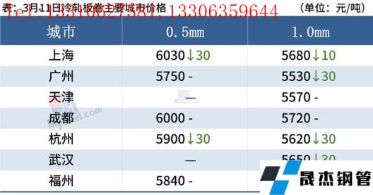 冷軋板卷:3月11日,全國24個主要城市1.0mm冷卷均價5674元/噸,較上個交易日下跌3元/噸。黑色電子盤震蕩偏強運行,但是冷軋板卷上漲動力不足,商家主流操作仍以出貨套利為主,成交表現尚可。就下周市場而言;成本方面,當前熱卷原料表現較為強勢,冷熱價差處于合理范圍之內,加之政策方面,無縫厚壁鋼管廠家3月期貨政策多以上漲為主。雖然全國冷軋板卷庫存壓力較大,但當前冷軋板卷成本支撐較強。綜合來看,預計下周全國冷軋板卷價格或將區間震蕩運行。