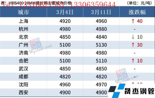 截至3月11日,全國(guó)主要城市20mm三級(jí)抗震螺紋鋼均價(jià)4952元/噸,周環(huán)比上漲6元/噸;8.0mmHPB300高線均價(jià)5164元/噸,周環(huán)比上漲3元/噸。