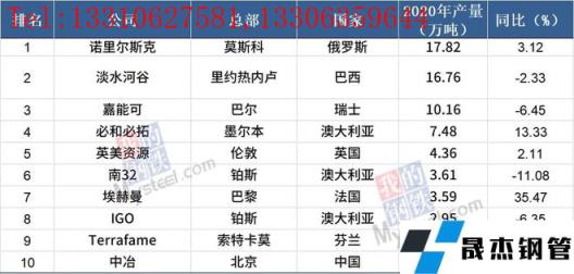 以上為全球十大鎳生產(chǎn)商排名,2020 年全球鎳產(chǎn)量總計(jì)約 220 萬噸。詳情請點(diǎn)擊》》