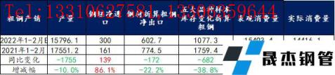 綜上所述,1-2月粗鋼實(shí)際消費(fèi)同比降幅僅為5%,明顯高于市場(chǎng)預(yù)期。但從后期供需預(yù)估表現(xiàn)來(lái)看,厚壁無(wú)縫鋼管復(fù)產(chǎn)節(jié)奏或高于需求釋放力度,進(jìn)而使得消費(fèi)承壓,價(jià)格上漲難度加大。