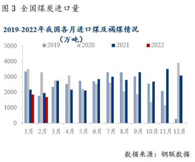 1-2月我國進口煤同環比大幅下降。2022年1-2月進口煤炭3539萬噸,同比下降14.0%,降幅比上年12月份收窄6.9個百分點。主要是受印尼1月煤炭禁止出口政策影響,影響1月下旬以及2月中上旬我國煤炭進口到港,疫情影響我國288口岸蒙煤通關量下降至100車左右,導致1-2月我國煤炭進口量同比大幅回落。2月下旬海外地緣沖突爆發,短期對我國進口有一定影響,對2月影響體現不大。
