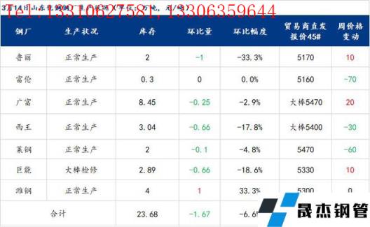 數(shù)據(jù):山東優(yōu)特無縫厚壁鋼管廠家?guī)齑?3.68萬噸,環(huán)比下降1.67萬噸,減少6.59%,同比下降0.41萬噸,降幅1.7%。