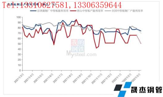 由于前期京津冀地區受到“2+26”座城市秋冬季限產、冬殘奧會限產等政策,產能利用率出現了明顯的下滑。隨著采暖季的結束以及東殘奧會的閉幕,鋼企的產能利用率出現了回升,截至3月18日,全國中厚板鋼企產能利用率79.13%,京津冀地區中厚板鋼企產能利用率77.55%,唐山地區中厚板鋼企產能利用率為65.53%,隨著3月19日唐山疫情突發,無縫厚壁鋼管廠家的復產節奏與物流均受到了影響,當下原料供給是當下比較棘手的問題,短期內爐料補給不足,鋼企被迫停產的可能性較大。預計3月底,唐山中厚板產能利用率或將大幅下降,全國中厚板鋼企產能利用率預計在70%左右。