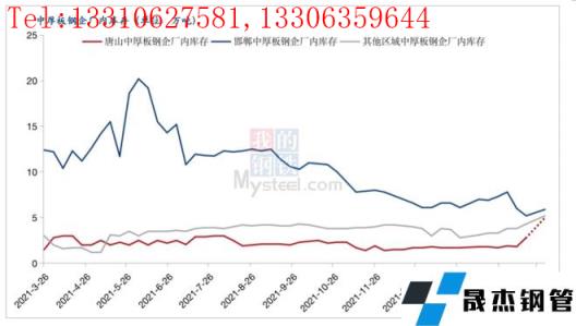 截至3月18日,京津冀地區中厚板廠內庫存為12.3萬噸,邯鄲地區5.2萬噸,唐山地區2.8萬噸,其他地區4.3萬噸。由于交通管制,車輛進出廠困難,鋼企要求司機持有48小時核酸檢測陰性證明和行程碼綠碼以及車輛通行證三證齊全方可出入廠,基本上運輸處于停滯狀態。部分鋼企工人封控在廠區,雖然保持生產,但是班次有所減少,并且全員做核酸。綜合來看,預計月底中厚板鋼企廠內庫存會有大幅累計,唐山中厚板鋼企廠內庫存預計5萬噸左右,京津冀地區中厚板鋼企庫存預計達到15萬噸。