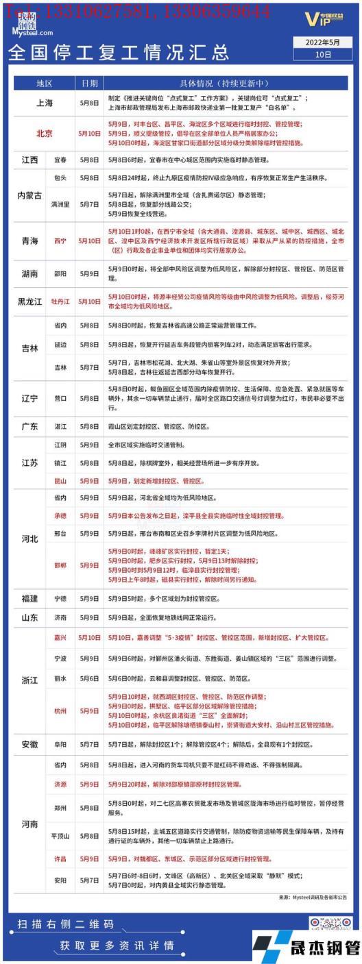 截至5月10日,據不完全統計,共有17個省份發布了停工復工最新信息。5月9日,北京豐臺區、昌平區、海淀區多個區域進行臨時封控、管控管理。邯鄲多區域實行封控管理。5月10日1時起,西寧市全域采取從嚴從緊的防控措施,全市(區)行政及各企事業單位和團體均實行居家辦公。具體情況如下: