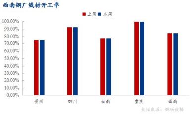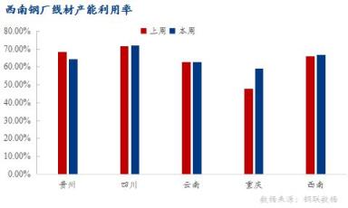 貴州區域:個別無縫厚壁鋼管廠家停產檢修尚未恢復生產,線材產能利用率64.24%,環比下降4.28%;開工率75%,環比持平;周產量3萬噸,環比減少0.2萬噸。