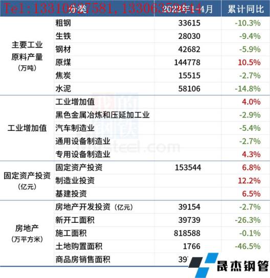 1-4月份,全國規(guī)模以上工業(yè)增加值同比增長4.0%,比1-3月份回落2.5個(gè)百分點(diǎn)。4月全國粗鋼日均產(chǎn)量309.27萬噸,環(huán)比增長8.6%。