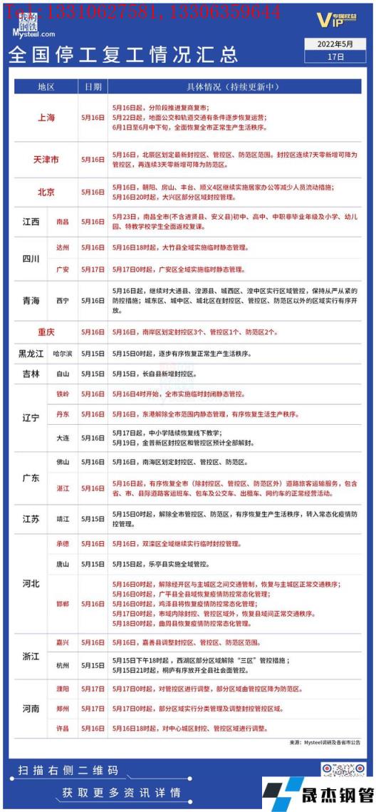 截至5月17日,據(jù)不完全統(tǒng)計(jì),共有15個(gè)省份發(fā)布了停工復(fù)工最新信息。5月16日起,上海分階段推進(jìn)復(fù)商復(fù)市。天津多地劃分為封控管控區(qū)。湛江有序恢復(fù)道路旅客運(yùn)輸服務(wù)。四川廣安市廣安區(qū)、達(dá)州市大竹縣全域?qū)嵤┡R時(shí)靜態(tài)管理。具體情況如下: