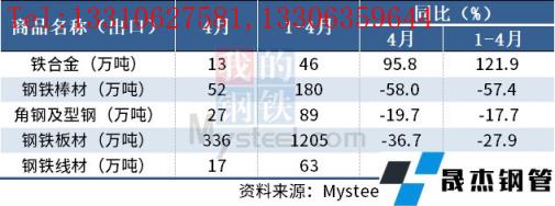 4月,中國(guó)出口鋼鐵棒材52萬(wàn)噸,同比下降58.0%;1-4月累計(jì)出口180萬(wàn)噸,同比下降57.4%。其他出口情況如下表所示: