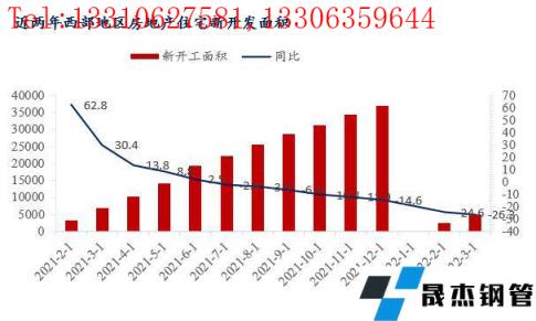 2022年以來,從上圖可以看出來,受住房不炒政策受影響,西北區域各省市房地產開發進度緩慢,房地產開發企業投資完成額以及新開工面積同比均是小幅下降。分省市來看,陜西作為西北經濟龍頭老大,房地產開發投資表現較好。2022年一季度,陜西省房地產開發企業完成投資674.03億元,同比增長5%,比1-2月提高1.8個百分點。而甘肅區域,一季度GDP同比增長5.3%,固定資產投資同比增長12.9%。其中,項目投資增長13.4%,房地產開發投資增長11.7%,商品房銷售面積下降10.7%。另外如分別是寧夏區域房地產開發投資增長增速為-1%。這在去年寧夏區域房地產開發投資增速為正數,今年面臨較大下行壓力。整體來說,由于受疫情以及資金問題,工程項目進度不如預期,厚壁無縫鋼管需求量同比減少,這也是前期西北區域建筑厚壁無縫鋼管消化緩慢以及庫存積壓原因。