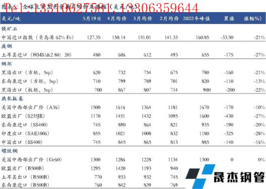 截至5月19日,中國鐵礦石進(jìn)口從4月初峰值累計(jì)下跌21%,土耳其廢鋼累計(jì)跌幅達(dá)到27%。從各品種區(qū)域價(jià)格走勢(shì)來看,熱卷綜合跌幅達(dá)到20%,而螺紋鋼跌幅在8%左右,歐洲熱卷價(jià)格累計(jì)跌幅為27%,相比之下美國跌幅最小,約10%。(圖表5)