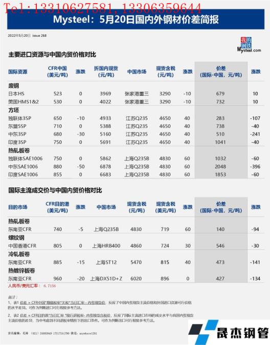 免責聲明:本網站(山東聊城晟杰無縫鋼管廠www.qiazhuo.cn)刊載的“2022年05月20日日報:國內外鋼材_無縫鋼管價差匯總(2022.5.20)”等均源于網絡,版權歸原作者所有,且僅代表原作者觀點,本文所載信息僅供參考。轉載僅為學習與交流之目的,如無意中侵犯您的合法權益,請及時聯系刪除。本網站刊登此篇文章并不意味著本站贊同其觀點或證實其內容的真實性,我們不對其科學性、嚴肅性等作任何形式的保證。如果侵犯了您的版權,請盡快聯系我們予以撤銷,謝謝合作!