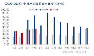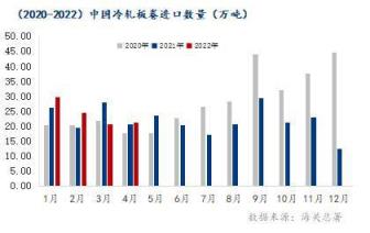 海關總署數據顯示:2022年1-4月份我國冷軋板(帶)出口總量共計159.53萬噸,年同比下降40.79%。2022年1-4月份我國冷軋板(帶)進口總量共計96.25萬噸,年同比上升1.90%。