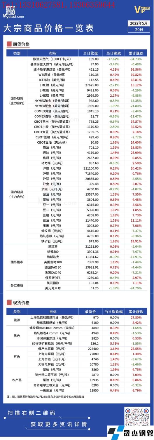 免責聲明:本網站(山東聊城晟杰無縫鋼管廠www.qiazhuo.cn)刊載的“俄烏局勢丨大宗商品價格一覽表(5月20日)”等均源于網絡,版權歸原作者所有,且僅代表原作者觀點,本文所載信息僅供參考。轉載僅為學習與交流之目的,如無意中侵犯您的合法權益,請及時聯系刪除。本網站刊登此篇文章并不意味著本站贊同其觀點或證實其內容的真實性,我們不對其科學性、嚴肅性等作任何形式的保證。如果侵犯了您的版權,請盡快聯系我們予以撤銷,謝謝合作!